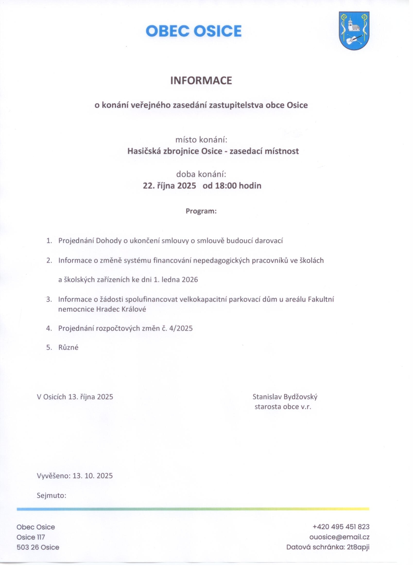 Informace o konání veřejného zasedání zastupitelstva obce Osice